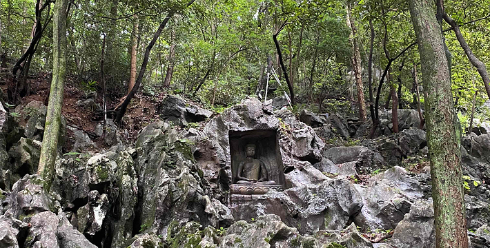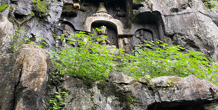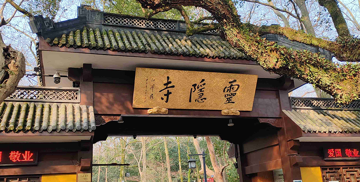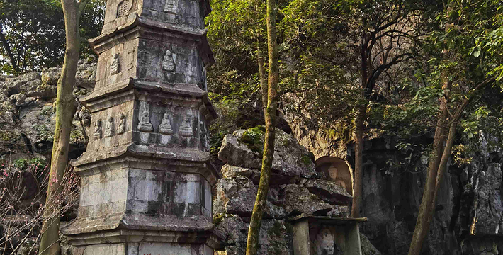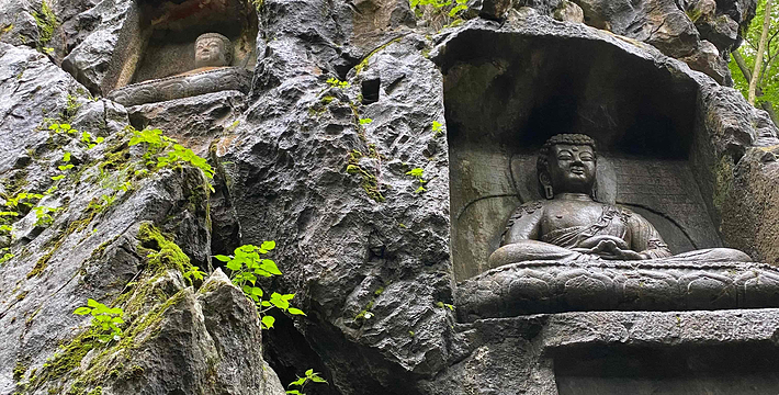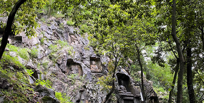 灵隐(飞来峰)景区位于西湖西面,包括灵隐寺和飞来峰两个主要景观。飞来峰不大也不高,却汇聚了几百处不同朝代的菩萨、高僧造像,有种融合之美。山中的灵隐寺是杭州最古老的寺院,香火旺盛,可以买香花券入寺祈愿。景区本身并不大,步行游玩即可。进入大门后往左,没一会儿就能看到飞来峰,沿着林中小径不出5分钟看到青林洞入口,据说洞前的石板曾是济公的睡床,睡一睡将不再为尘世所扰,引得许多游客在这里躺一躺。往北走,玉乳洞里有北宋十八罗汉造像,洞口东端两侧还有禅宗六祖像,十分精美。继续往前的龙泓洞俗称观音洞,里面有一道石缝“一线天”,不是所有人都能看到那道穿过石缝的光亮,因此常会看到大家伸长脖子往上看。洞外的崖壁上布满了佛像石刻,较低处,可以看到“白马驮经”的宋代石刻。龙泓洞口的理公塔,是杭州现存唯 一的明代塔,由此沿着冷泉溪走,还能看到大肚弥勒,这是飞来峰最 大的一尊佛像。石刻对面便是著名的灵隐寺,进入灵隐寺需另购香花券30元,但还是很值得一看,天王殿里的韦驮像是南宋时期的遗物,由整段香樟木刻成,十分珍贵。新修的永福寺在灵隐寺旁边,顺着指示牌往上走就能到,寺院里除了清幽的古建之外,还有一片茶园和许多古树,风景相当不错。到了永福寺必须原路返回,如果想要爬山,在返回灵隐寺的半路有一岔道,可从韬光寺出口通往北高峰,这段路人少幽静,走走感觉很不错。北高峰可以爬山或者坐索道上去,山巅的灵顺寺是杭州著名的古寺之一。