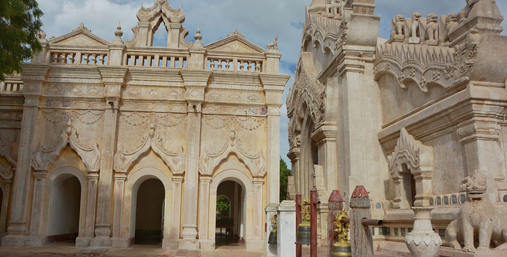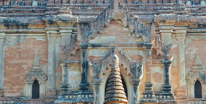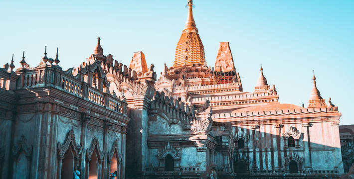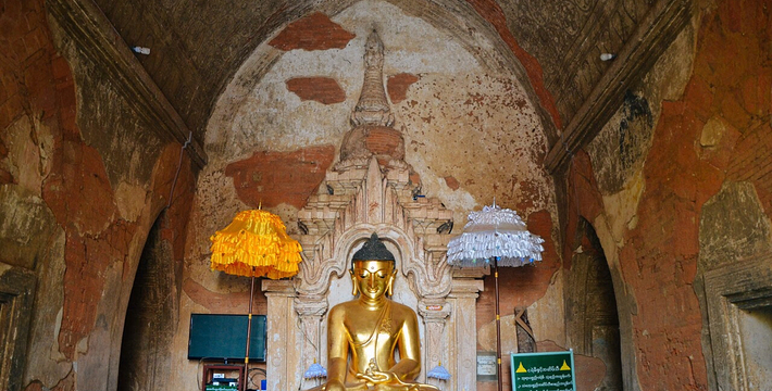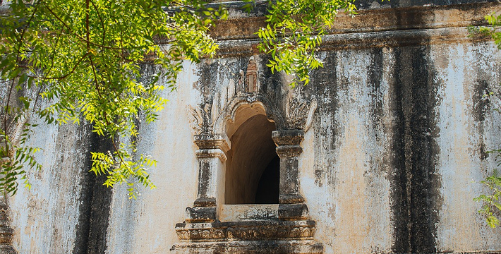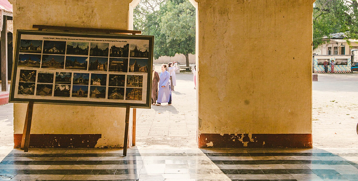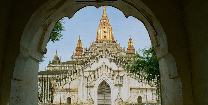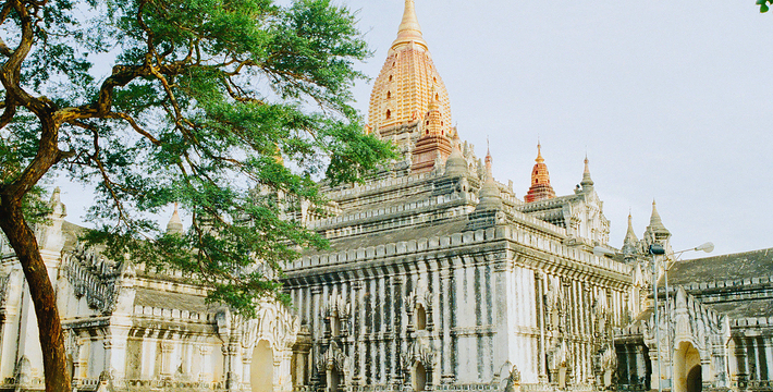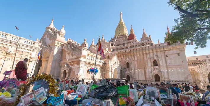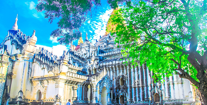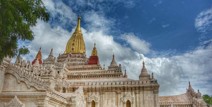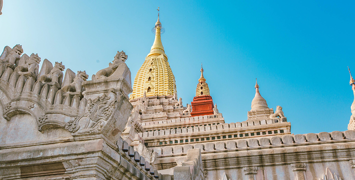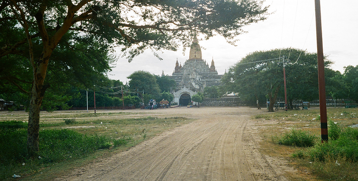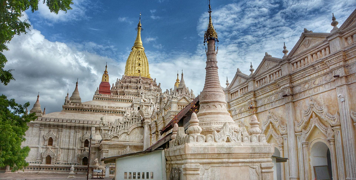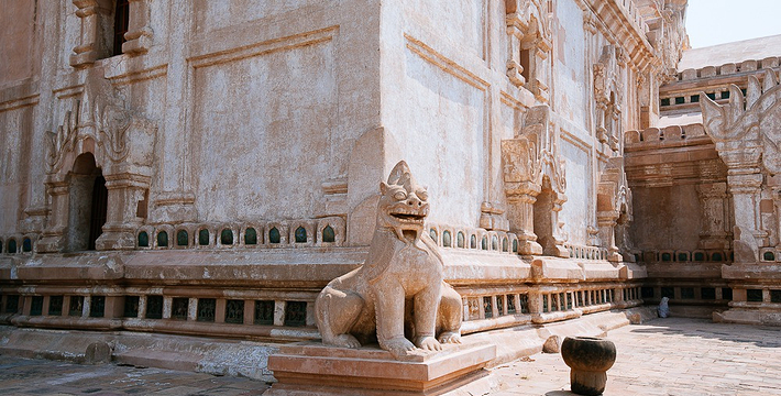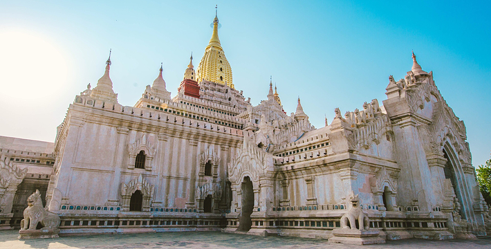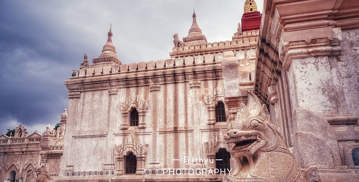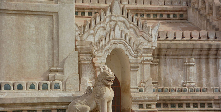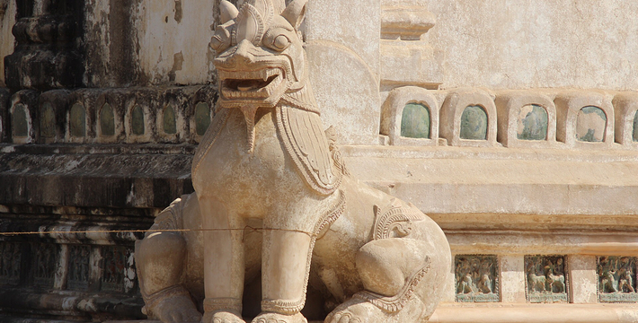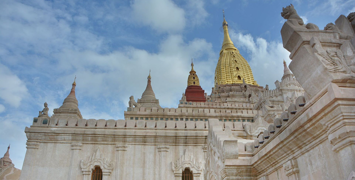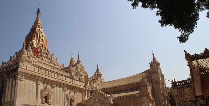 整个寺院呈正方形,占地近百亩。院子正中心就是阿南达塔,塔座是印度风格的正方形大佛窟,东南西北面各有一门,门内有一尊高约十米的释迦立佛。在塔座之上屹立着70多米高的塔身,非常高大宏伟。塔身为浅黄色,外壁上有数千尊大小佛像和佛本生故事的彩陶浮雕,在主塔周围又环绕着众多的小塔、佛像及各种动物和怪兽雕塑。