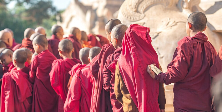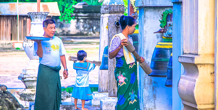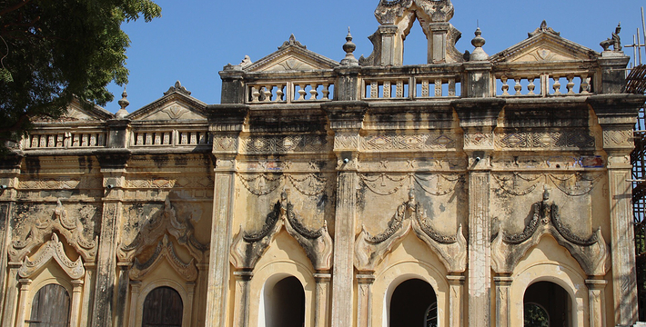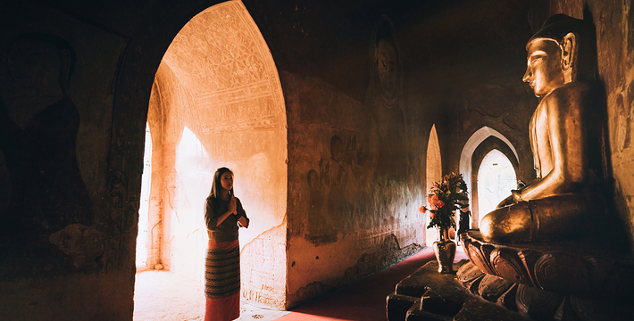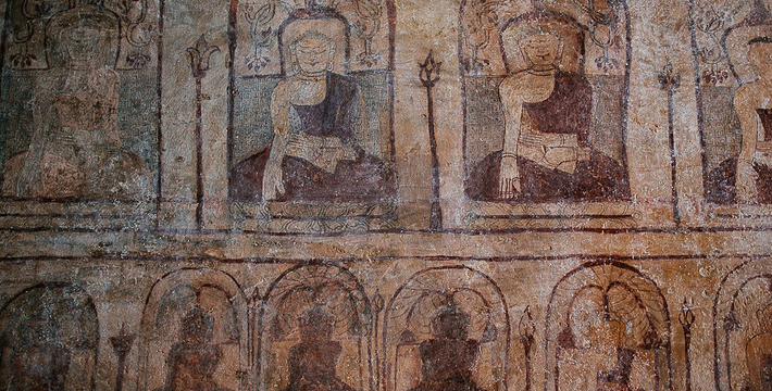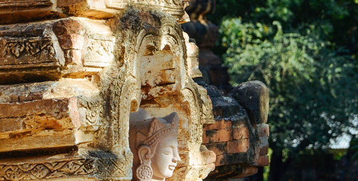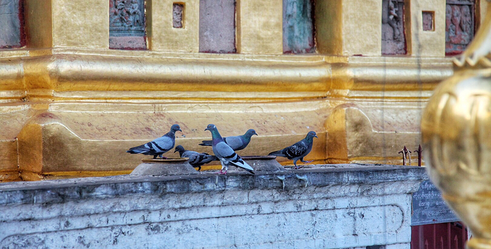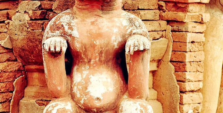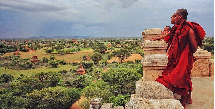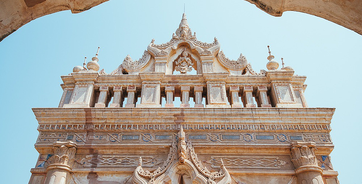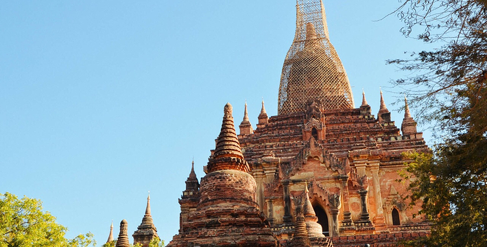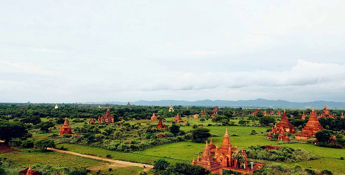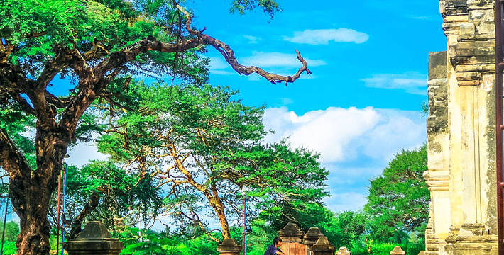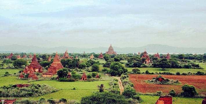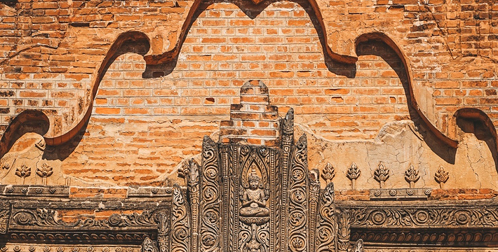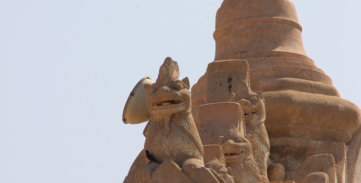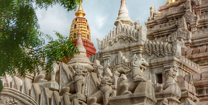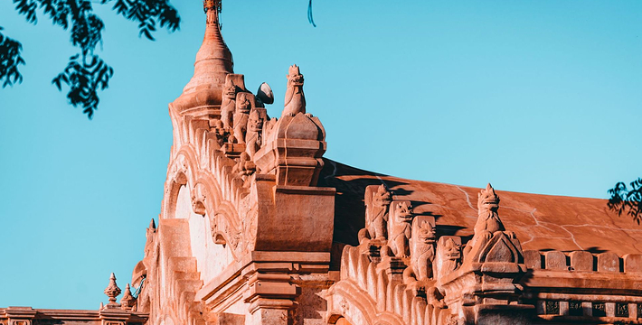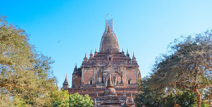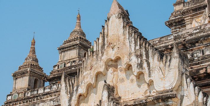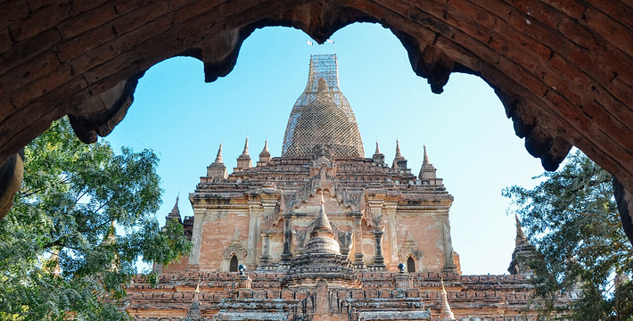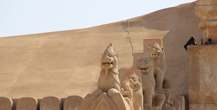 整个寺院呈正方形,占地近百亩。院子正中心就是阿南达塔,塔座是印度风格的正方形大佛窟,东南西北面各有一门,门内有一尊高约十米的释迦立佛。在塔座之上屹立着70多米高的塔身,非常高大宏伟。塔身为浅黄色,外壁上有数千尊大小佛像和佛本生故事的彩陶浮雕,在主塔周围又环绕着众多的小塔、佛像及各种动物和怪兽雕塑。