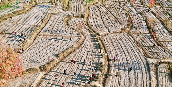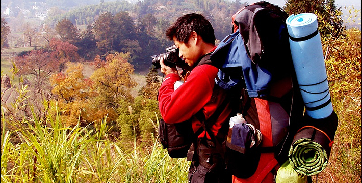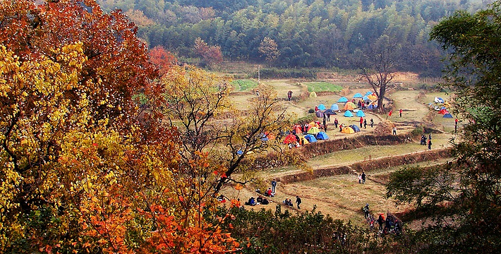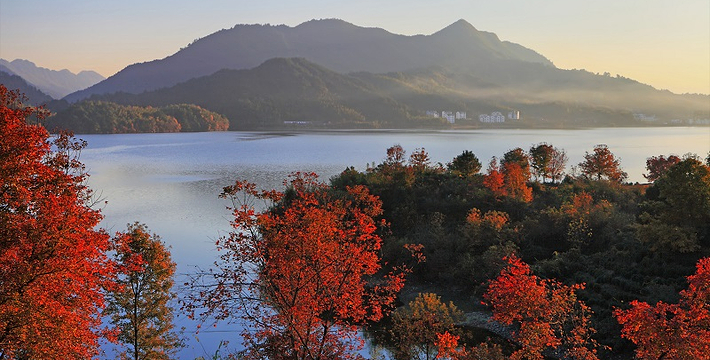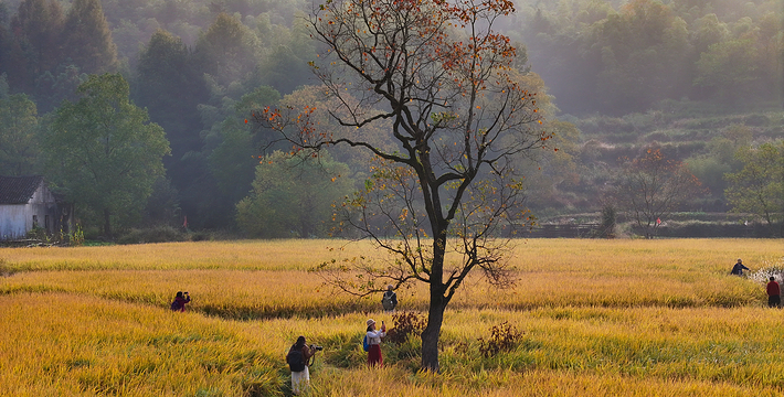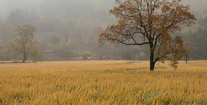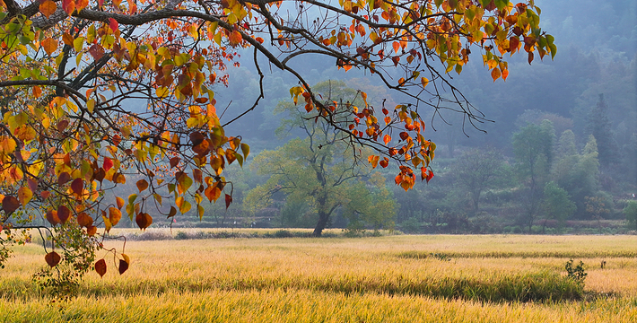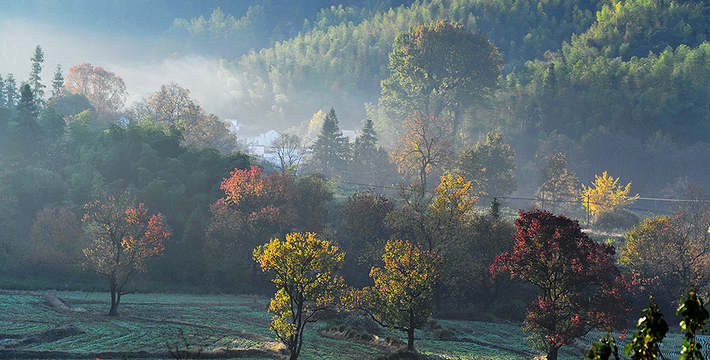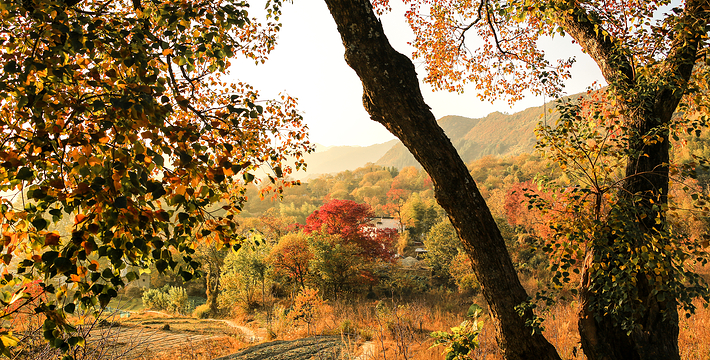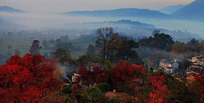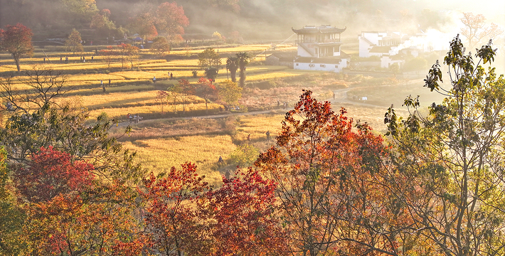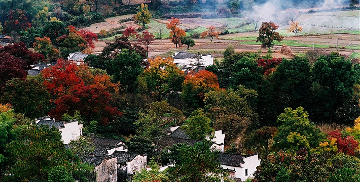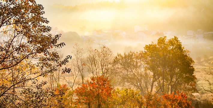 薄薄的雾气笼罩在树上,似有似无,农家的小屋若隐若现,红枫丛中忽露出飞檐翘角,粉墙黛瓦在金黄叶子的掩映下,就如中国山水画般诗情画意”摄影者胶卷的地方,任意选取一个角度,都是一幅绝美的风景画。
