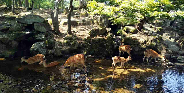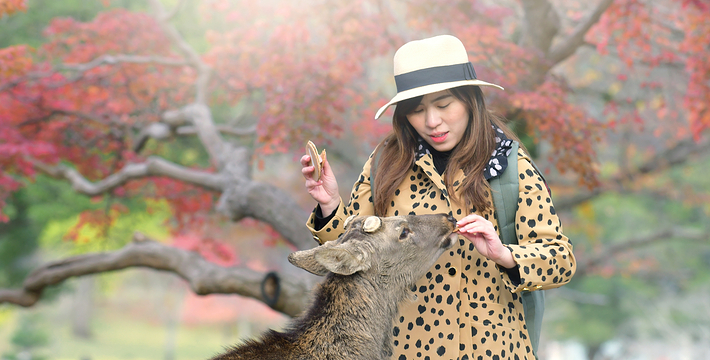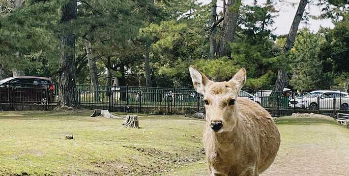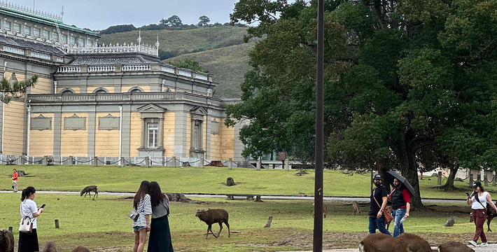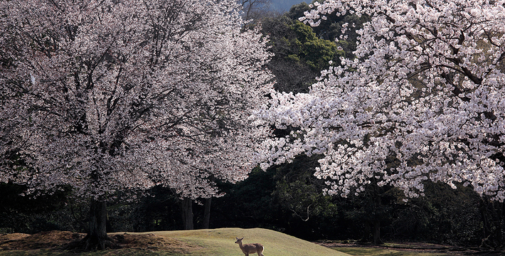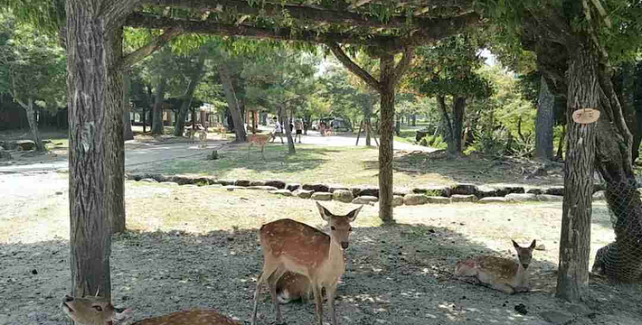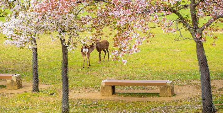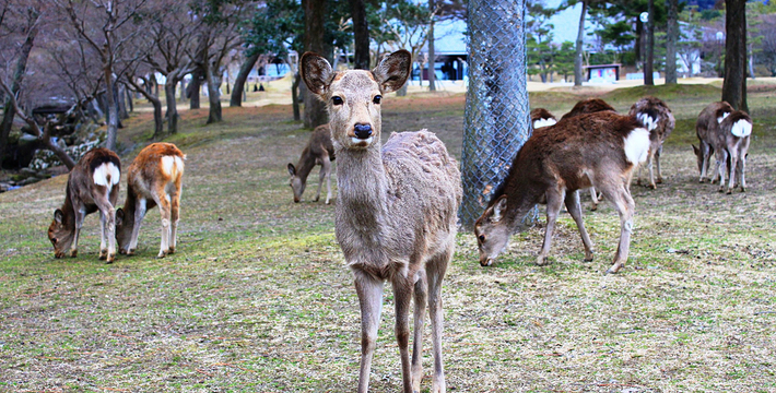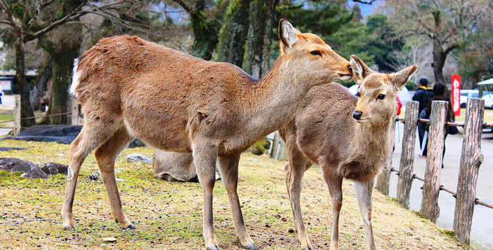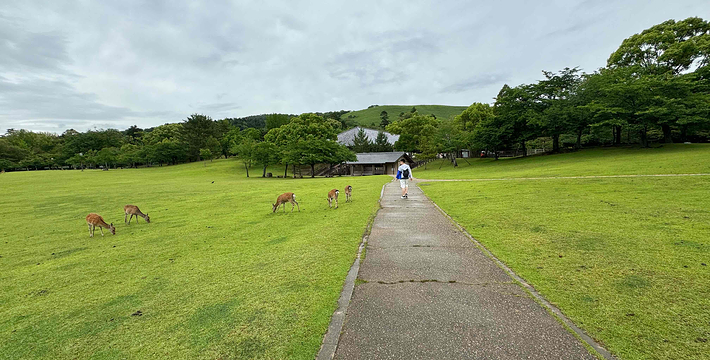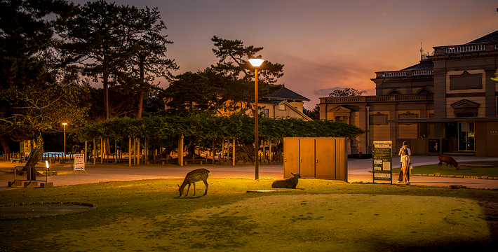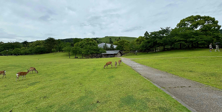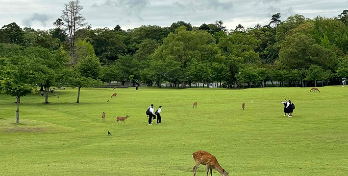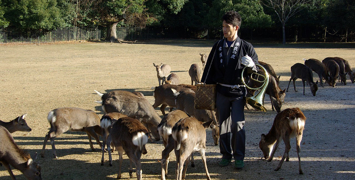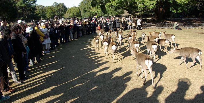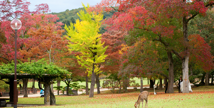 奈良公园位于奈良市街的东边,东西长4公里、南北宽2公里,面积广阔,若草山、东大寺、春日大社、国立博物馆等奈良的名胜古迹大多在这里。在明治21年(1888年)成为县立公园,是日本现代公园的先驱之一。大正11年(1922年)被指定为日本的国家名胜。 成群嬉戏于公园里的鹿,因与春日大社流传的白鹿传说有关而受到保护,且被指定为国家的自然保护动物4、5月,或是满山红叶的秋天等出游行乐、毕业旅行的季节。但是,在淡季时您可悠闲自在的在此散步。一年四季无论何时,这里都有吸引人的景观。 其中有1200头鹿生活在这里,这些鹿大多温顺而讨人喜爱。