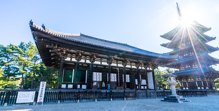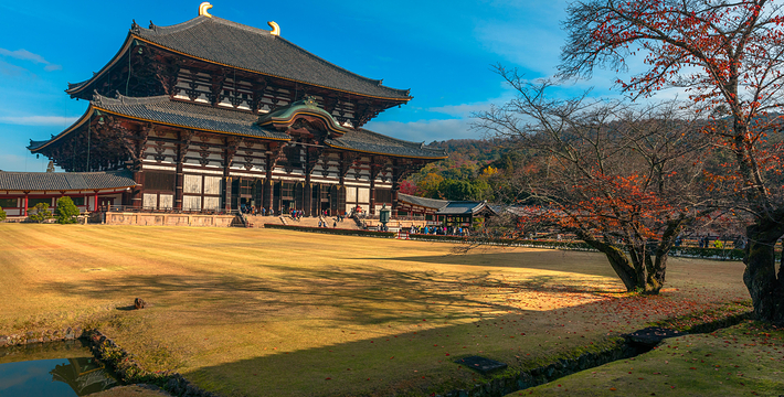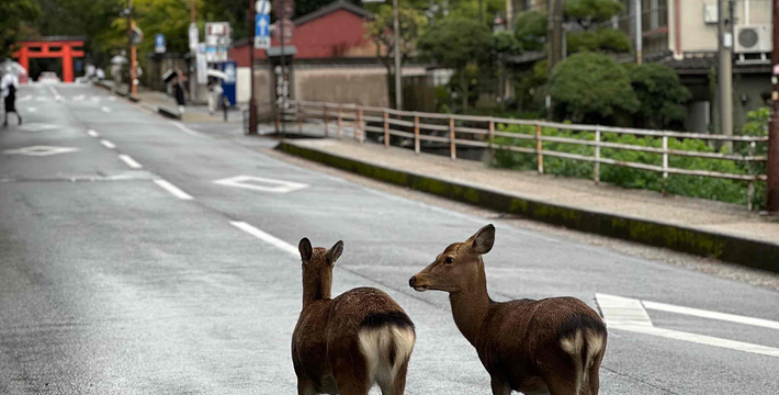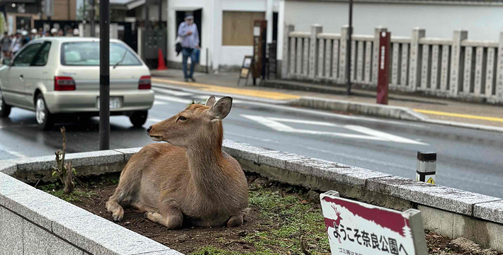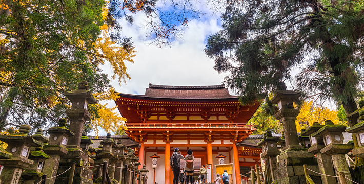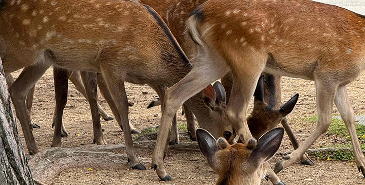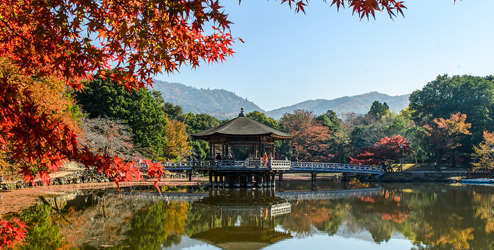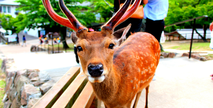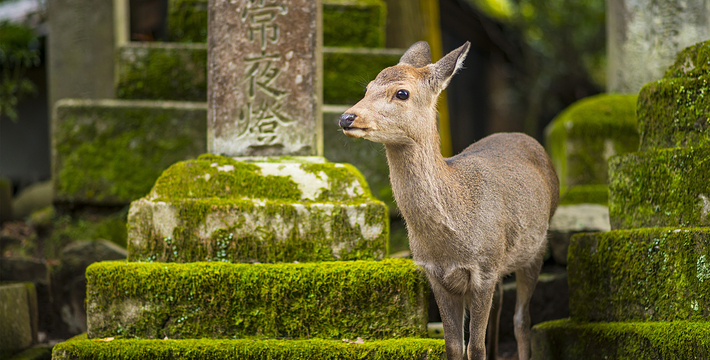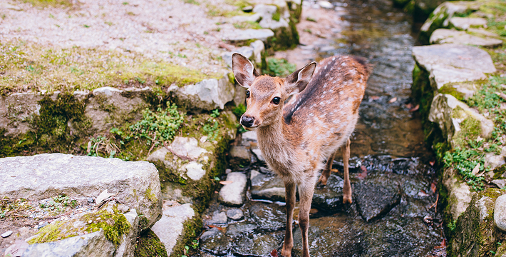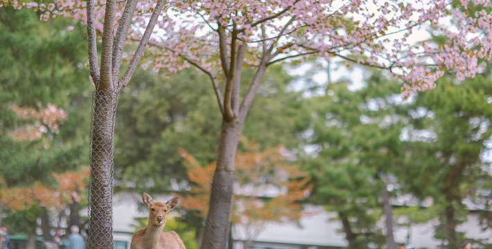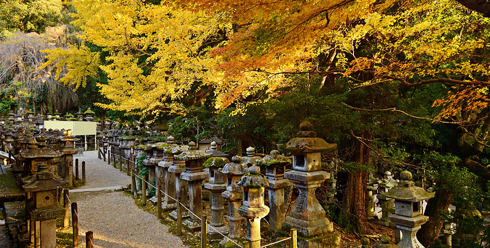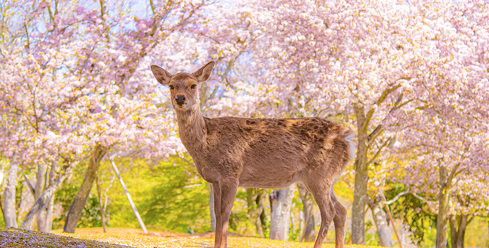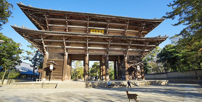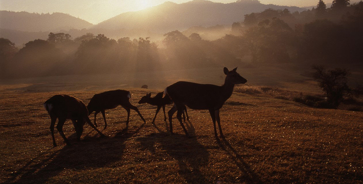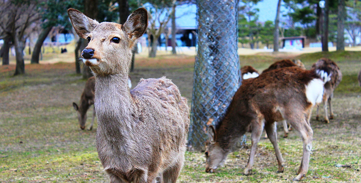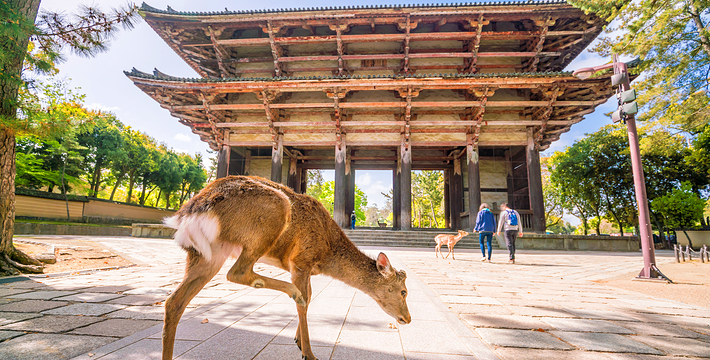 奈良公园位于奈良市街的东边,东西长4公里、南北宽2公里,面积广阔,若草山、东大寺、春日大社、国立博物馆等奈良的名胜古迹大多在这里。在明治21年(1888年)成为县立公园,是日本现代公园的先驱之一。大正11年(1922年)被指定为日本的国家名胜。 成群嬉戏于公园里的鹿,因与春日大社流传的白鹿传说有关而受到保护,且被指定为国家的自然保护动物4、5月,或是满山红叶的秋天等出游行乐、毕业旅行的季节。但是,在淡季时您可悠闲自在的在此散步。一年四季无论何时,这里都有吸引人的景观。 其中有1200头鹿生活在这里,这些鹿大多温顺而讨人喜爱。