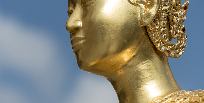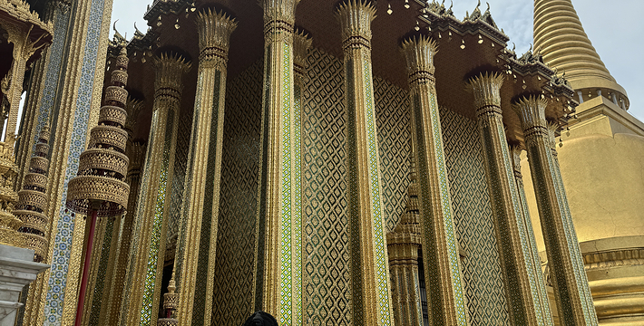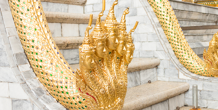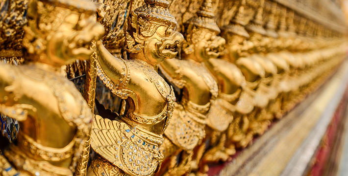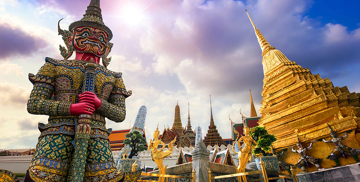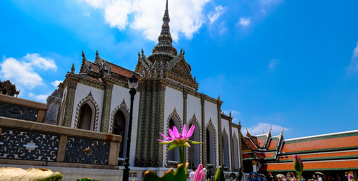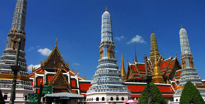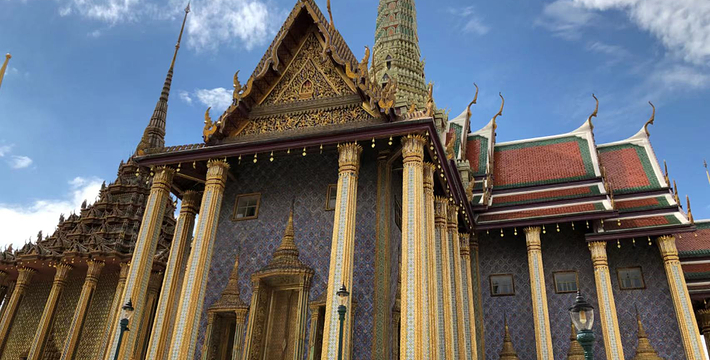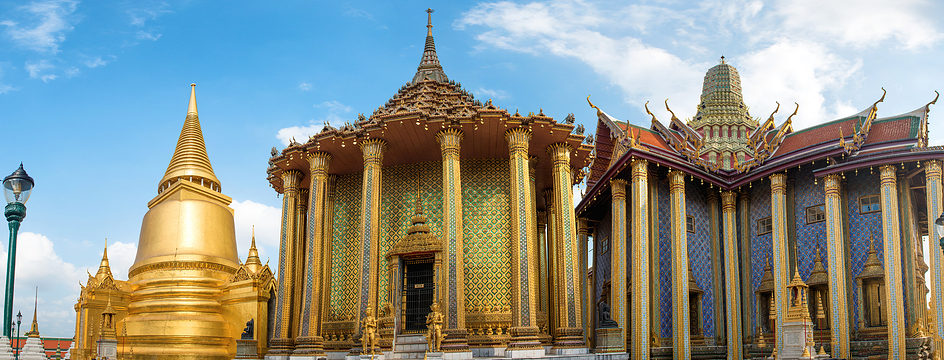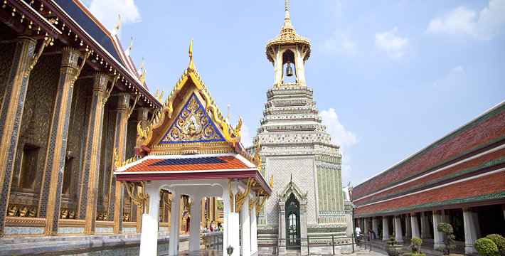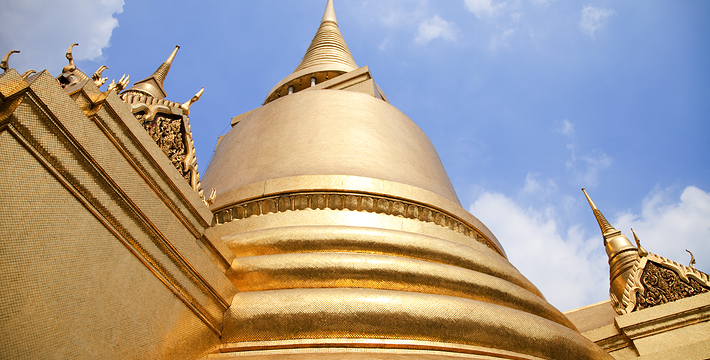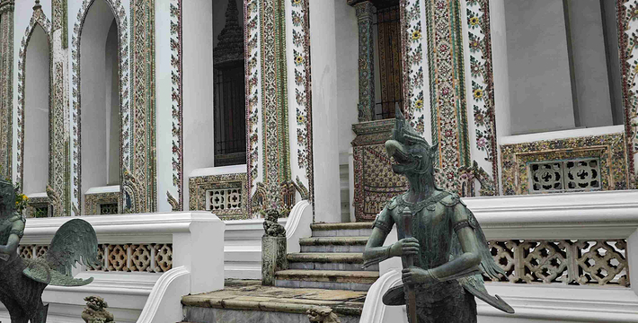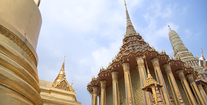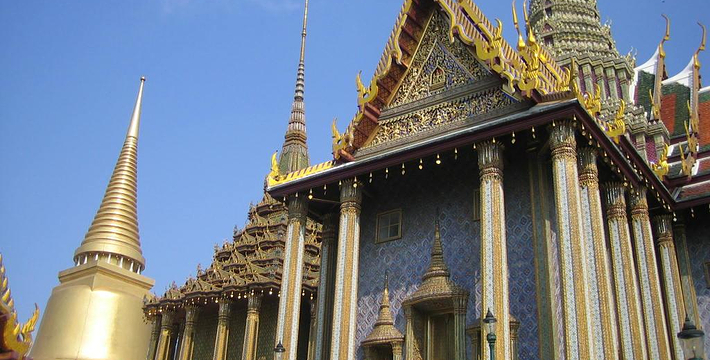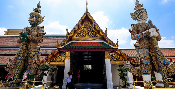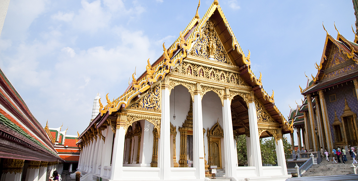 玉佛寺位于曼谷大王宫的东北角,也是泰国三大国宝之一。建于1784年的玉佛寺是泰国大王宫的一部分,面积约占大王宫的1/4。玉佛寺是泰国王族供奉玉佛像和举行宗教仪式的场所,因寺内供奉着玉佛而得名。寺内有玉佛殿、先王殿、佛骨殿、藏经阁、钟楼和金塔。玉佛殿是玉佛寺的主体建筑,大殿正中的神龛里供奉着被泰国视为国宝的玉佛像。玉佛高66厘米,阔48厘米,是由一整块碧玉雕刻而成。