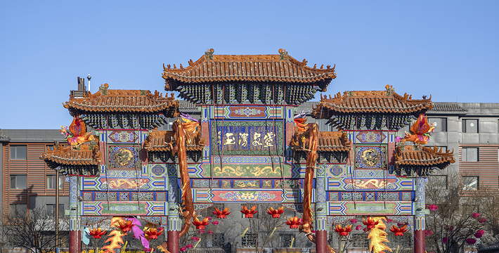 释迦牟尼像前有一对金色木雕巨龙,蟠于木柱之上,作双龙戏珠状。殿前汉白玉方形石座上,有明天启七年(1627)铸造的一对空心铁狮,昂首仰视,形象别致。召庙内另有山门、过殿、东西配殿及九间楼等建筑。寺前原有玉泉井一口,泉水清冽,并将此5字雕成匾额,悬挂在山门上。