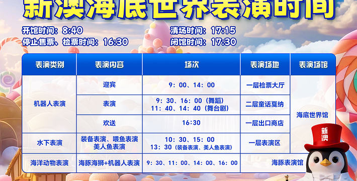 新澳海底世界可容纳2000人同时参观,主要包括海豚表演馆、小池区、企鹅馆、海豹馆、触摸池、海底隧道、表演休息区、科普展厅、科普教室以及海洋精品店、观海餐厅等。