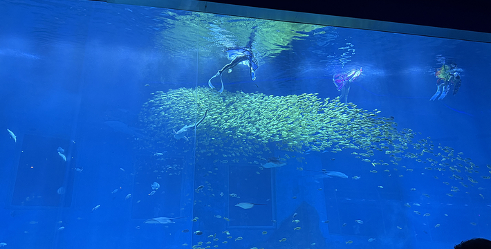 水母馆8米长的侧旋缸,巨大的水母幕墙,展出的是享有“水中仙子,海中明月”美称的海月水母。除此之外,还有彩色水母等9个品种的水母。