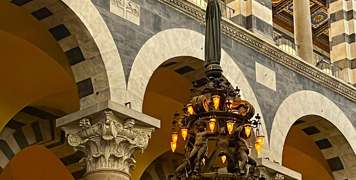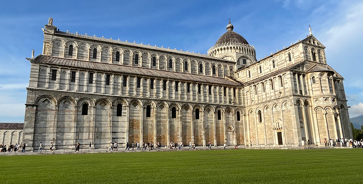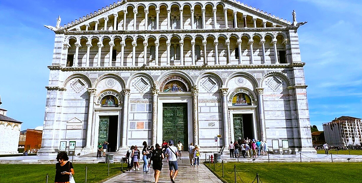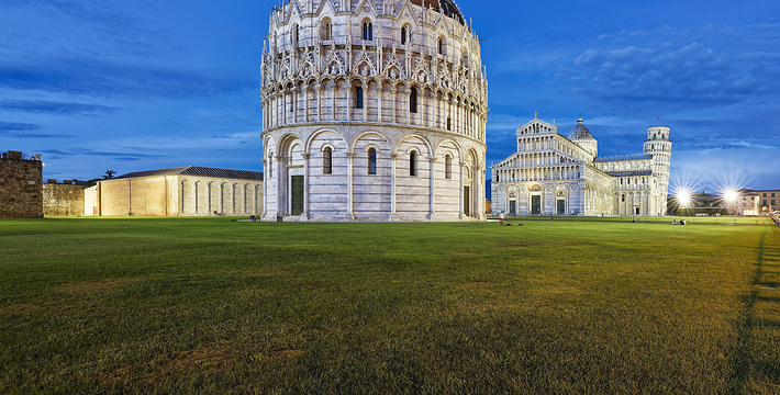 它位于比萨城的西北角,广场包含了比萨大教堂、洗礼堂、比萨斜塔和墓园。奇迹广场得名于意大利作家邓南遮1910年的小说《Forse che si forse che no》中的描写:L’Ardea roteò nel cielo di Cristo, sul prato dei Miracoli.(“Ardea旋转了基督的天空,旋转了奇迹的草地。”) 比萨大教堂是罗曼建筑的代表作品,始建于公元12世纪,后被大火焚毁后重新整修并扩建。至今仍能看到整修之后和之前大理石风格有所不同,如今已经被移至教堂后面成为侧门。大教堂正对面是近似圆柱形的圣若望洗礼堂(Battistero di San Giovanni),里面有旋转楼梯可以爬到中部。 在大教堂的斜后方则是著名的比萨斜塔(Torre di Pisa) ,比萨斜塔本身是作为大教堂的钟楼而修建的,至今顶部仍有大钟。斜塔的历史这里就不多说了,但是关于它的修缮则一直持续到今,据专家说现在斜塔的倾斜角度属于可控范围之内,而且将保持稳定。在斜塔下面有英文、意大利文、法文、西文、日文和中文的介绍斜塔修缮的文字。在大教堂的另一侧,大墙之内则是墓园。这里曾经是公墓,现在则改造成为博物馆,新的公墓比邻墓园在围墙外面。虽说是墓园,里面也不乏雕塑精品。奇迹广场内有3大片草坪,其中靠近城门的一片是可以供游人休息的,而里面的两片草坪则不能被踏入,广场另一侧是一排小商店,出售旅游纪念品和小吃。