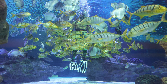 在这里生活着数千只来自世界各地的海洋生物,让您欣赏海洋,了解海底世界的奥秘。主体展示池容纳海水450万升,另有20个不同主题的展示池。弯曲透明的水下移动隧道带您漫步海底,亲眼目睹20000多尾形色各异、近在咫尺的海洋生物。一号馆拥有120米亚克力透明海底隧道,可使游人通过类似潜水员的视角全方位地观赏海底景观,海底世界主体展示池容纳海水450万立升,饲养着来自世界各地600种、6000多尾海洋鱼类。有凶猛的鲨鱼,美丽的鳐鱼,五彩斑斓的珊瑚礁鱼类。二号馆的南极展让您了解极地探险历程和极地大陆的传奇风貌与有趣的极地动物。馆内的国内首创真空缸让你利用高新技术与鱼类亲密接触。另有婀娜多姿的美人鱼表演、如诗如画的水下芭蕾、令人忍俊不禁的海狮表演和惊险的人鲨共舞等等。富国海底世界让人犹如置身安徒生笔下的童话世界,使你忘却了现实生活的烦恼,找回失落已久的童心。