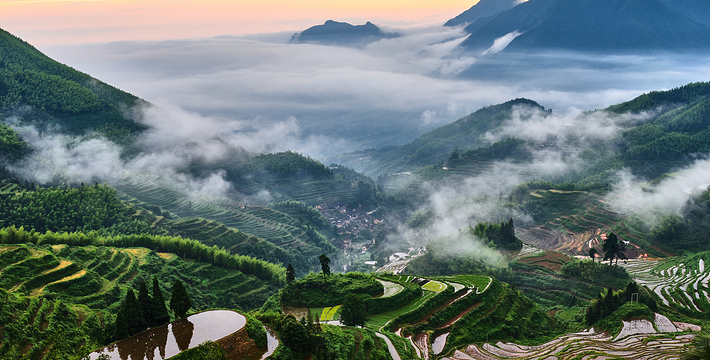 云和梯田景区总面积约50平方公里,海拔跨度200米至1400多米。核心区梯田共有700多层,量大面广,四季景观分明、独特,是省级的湿地公园,”。景区独特的地理和气候条件,于农耕文化、银矿文化、女神文化、畲族文化互相融合,形成了独特的人文与自然景观,景区内深林茂盛、山峦、飞瀑、奇峰、异石、村庄、田园风光等各种景观丰富。云和梯田已成为中国著名的摄影采风基地。夏天酷暑、冬天严寒,游人置身其中可感受到清新洁净的舒畅,是一处集尽兴旅游、休闲渡假、保健养身为一体的高品质生态旅游渡假区。云和梯田由于海拔较高,田中的水和河谷中的水蒸发而上,受气流影响而形成云海,水份又被林木充分吸纳,化为云雾烟雨,驻于高山丛林,山巅与田间时常白云缭绕,使之出现虚实与层次,组成一幅幅变幻莫测的天然画卷。每逢春末初夏,绮丽多姿的茫茫云海,时而象温驯的少女静卧山川、裸露胸怀,山峰、树木、房舍点缀其间,如同蓬莱仙境;时而象狂暴的潮,汹涌澎湃。雄姿勃发的云和梯田浮于茫茫云海之上,构成独特的奇观。