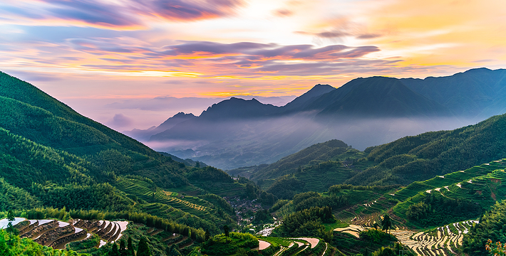 云和梯田景区总面积约50平方公里,海拔跨度200米至1400多米。核心区梯田共有700多层,量大面广,四季景观分明、独特,是省级的湿地公园,”。景区独特的地理和气候条件,于农耕文化、银矿文化、女神文化、畲族文化互相融合,形成了独特的人文与自然景观,景区内深林茂盛、山峦、飞瀑、奇峰、异石、村庄、田园风光等各种景观丰富。云和梯田已成为中国著名的摄影采风基地。夏天酷暑、冬天严寒,游人置身其中可感受到清新洁净的舒畅,是一处集尽兴旅游、休闲渡假、保健养身为一体的高品质生态旅游渡假区。云和梯田由于海拔较高,田中的水和河谷中的水蒸发而上,受气流影响而形成云海,水份又被林木充分吸纳,化为云雾烟雨,驻于高山丛林,山巅与田间时常白云缭绕,使之出现虚实与层次,组成一幅幅变幻莫测的天然画卷。每逢春末初夏,绮丽多姿的茫茫云海,时而象温驯的少女静卧山川、裸露胸怀,山峰、树木、房舍点缀其间,如同蓬莱仙境;时而象狂暴的潮,汹涌澎湃。雄姿勃发的云和梯田浮于茫茫云海之上,构成独特的奇观。