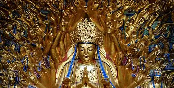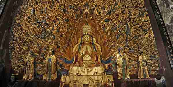 宝顶山位于大足区龙岗街道东北15公里处,海拔527.83米。巨型雕刻360余幅,以六道轮回,广大宝楼阁、华严三圣像。