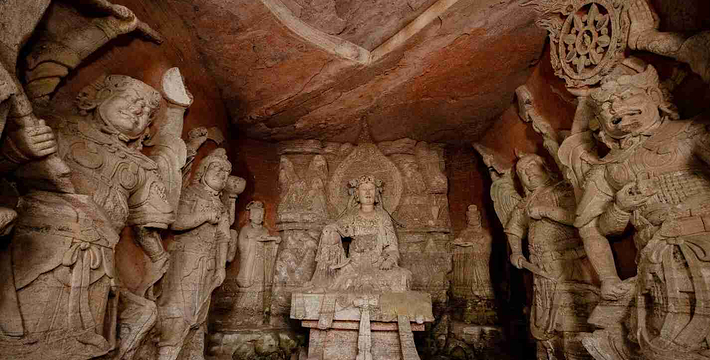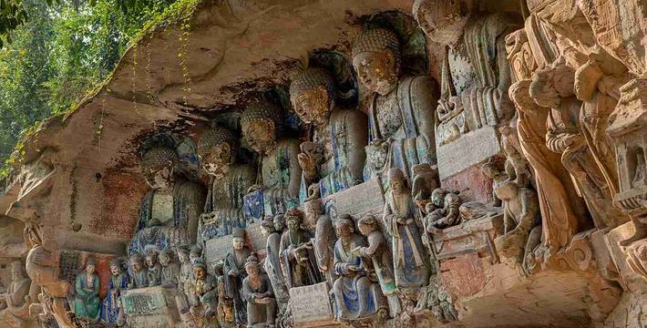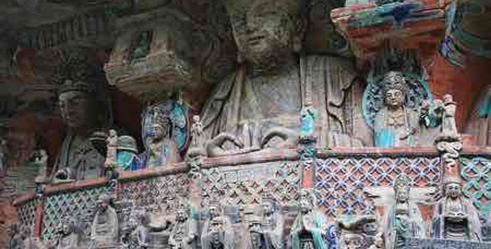 大足石刻群有石刻造像70多处,总计10万多躯,其以佛教造像为主,是中国晚期石窟造像艺术的典范。规模宏大,艺术精湛,内容丰富,与敦煌莫高窟、云冈石窟、龙门石窟、麦积山石窟等中国四大石窟齐名。