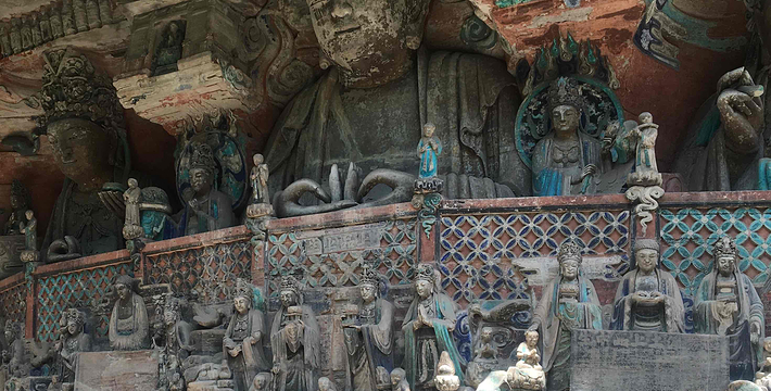 大足石刻群有石刻造像70多处,总计10万多躯,其以佛教造像为主,是中国晚期石窟造像艺术的典范。规模宏大,艺术精湛,内容丰富,与敦煌莫高窟、云冈石窟、龙门石窟、麦积山石窟等中国四大石窟齐名。