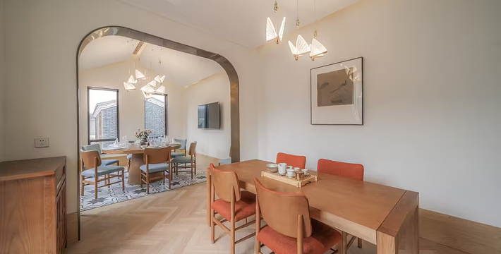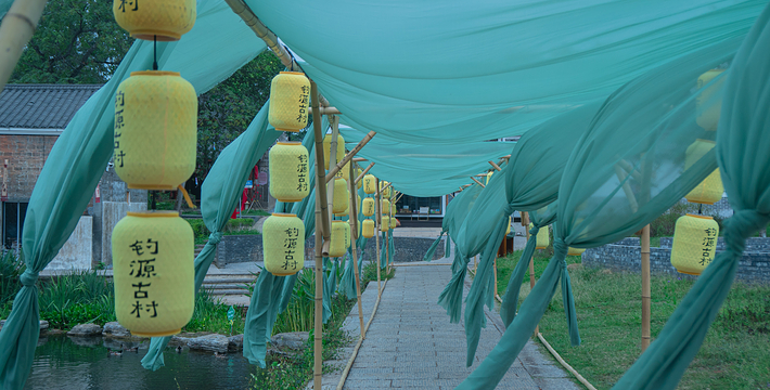 青石板铺成的巷道两旁,是四通八达的排水沟,天下大雨,巷中无积水,房屋前后瓦檐上的骑瓦封火墙,刺向蓝天。幢幢民居,既有常见的单檐屋面,又有不多见的垂檐瓦顶;既有1进2厢、2进4厢式厅房,又有庭园式、院墙式等风格迥罕的居室。令人不解的是,钓源村大多是“歪门邪道”,巷路、村道、塘岸没有一条是笔直到边的,建造者有意为之,巷道时宽时窄,院角有圆有方,墙面有正有侧,形成回环往复、参差跌宕的格局。专家们考证,这是应合古代阴阳八卦的理念,显现“天人合一”的道理。