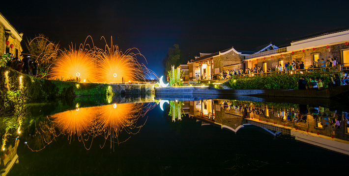 民居依两边的坡势铺展,7口大小不一的水塘串联,把村庄分成南北两半。一条条青石板铺就的巷道,曲折迂回伸向各幢古宅。从平整、光洁的青石板上走去,只见老屋高低错落,排列有序,显得幽得与苍老,引人入胜。全村现有村民150多户,800余人,存有明清建筑150多处,宗祠、家祠9座,书舍5处,古石桥2座。风姿各异的历代建筑,如一幅幅淡淡的民俗风情画,令人赏心悦目。建筑风格的丰富多样,隐含太极八卦的结构布局,形成了钓源古村群落的显著特色。