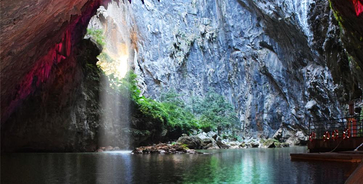 洞天仙境(又名穿天岩),是一个溪流穿山而过的岩洞,乘船游览,流程约200米,洞内洞厅广阔,钟乳石形态多样,洞顶有2个穿孔通天,光线从中透入洞里。洞内有一片陆地,生长着茂盛的阴生植物,密密麻麻,枝叶婆婆,呈原始状态,像这样的洞内小森林确是一个罕风奇观。看着这里有光、有水、有地、有林,感觉像走入另一个世界,“别有洞天”可能就是这样一意境吧。