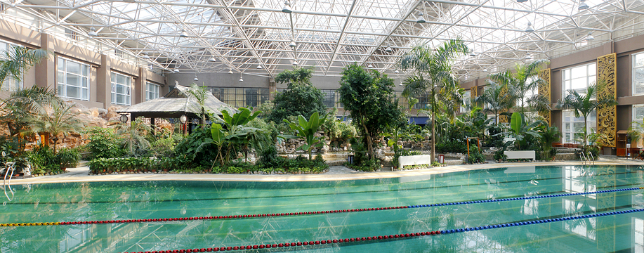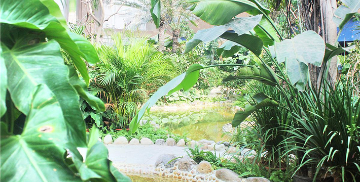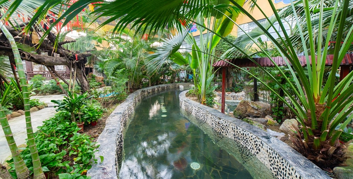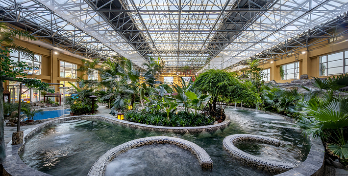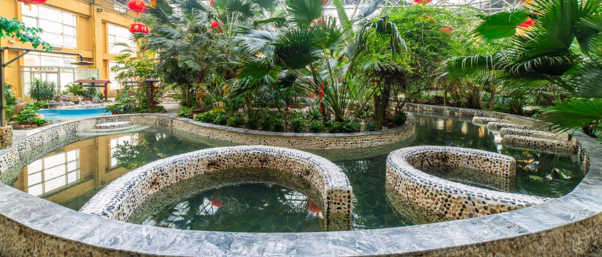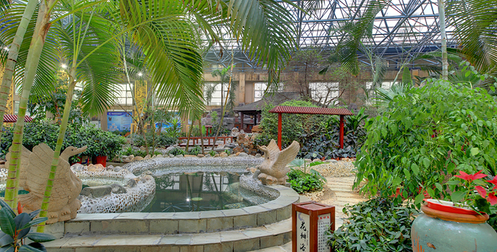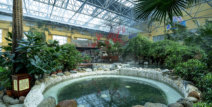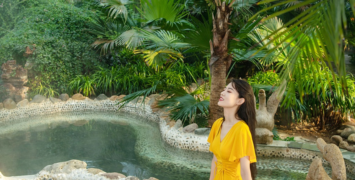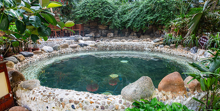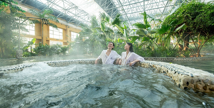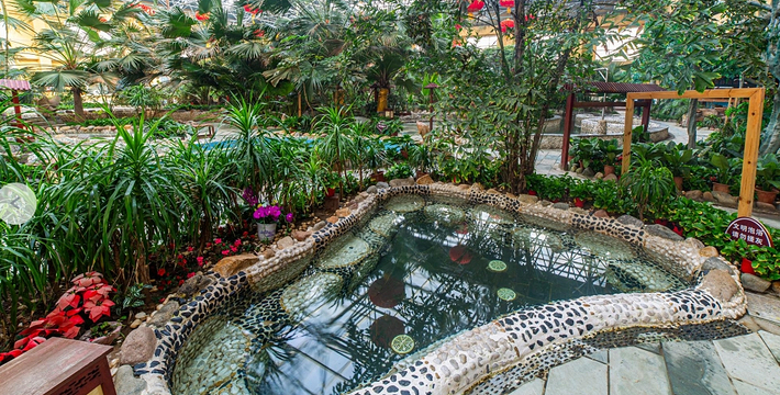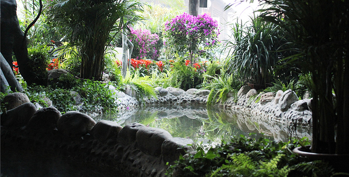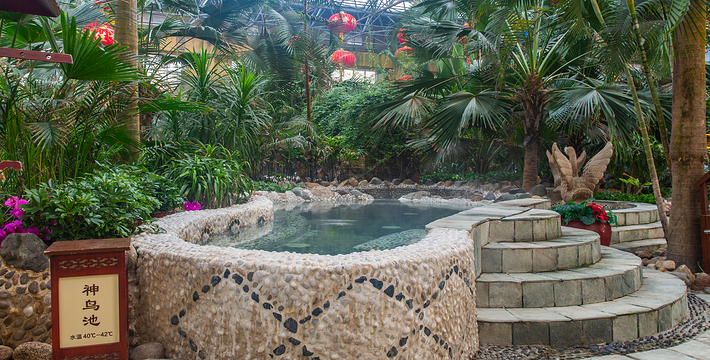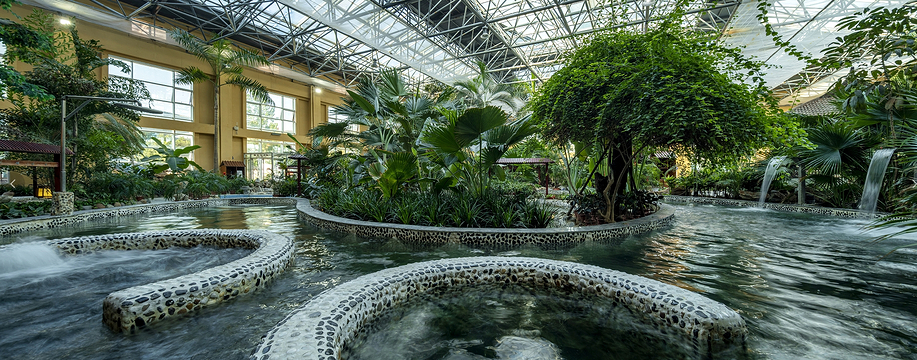 室内泉区是一个高科技大温室,从东南亚移植而来的芭蕉、棕榈等热带植物茂盛生长,仿佛来到了西双版纳。