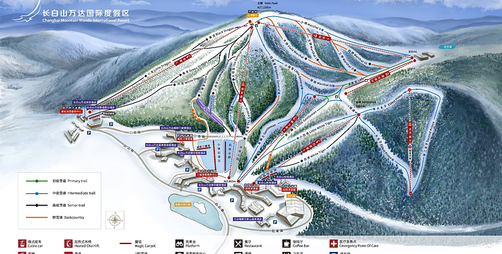 万达长白山国际度假区滑雪场总占地面积6.34平方公里,雪道面积94万平方米,造雪面积104万平方米。滑雪场处于世界滑雪黄金纬度42°—46°下,降雪量为1.5—2米,雪期为每年的11月中旬—次年4月中旬,达150天。