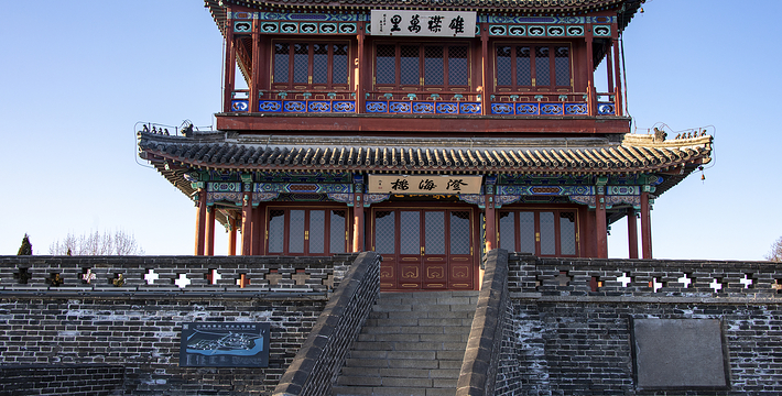 位于山海关城南4公里的渤海之滨,这里是明长城的东部起点。老龙头地势高峻,有明代蓟镇总兵戚继光所建“入海石城”。入海石城犹如龙首探入大海、弄涛舞浪,因而名“老龙头”。 老龙头景区由入海石城、海神庙、靖卤台、南海口、澄海楼、宁海城和滨海长城七部分组成。 澄海楼是老龙头的制高点,是观海的胜地。其东西墙壁镶有清代皇帝及文人咏澄海楼诗作的卧碑,楼内陈列着老龙头出土文物和部分党和国家领导人的题词和题诗;宁海城内校场、龙武营、将台等军事建筑展示了明代要塞风貌;保存完好的明代长城遗址具有独特的考古价值。 自清朝开国后,康熙、雍正、乾隆、嘉庆、道光都多次到过老龙头,其中乾隆皇帝4次来此登楼观海,留下了大量诗文墨宝。老龙头上的“天开海岳”碑,据传为唐代遗碑,这四个字道出了“放眼天际,苍茫一碧,天适地设”的绝妙景观之神韵。 登上老龙头,面对波涛汹涌、云水苍茫的大海,可尽览“长城万里跨龙头,纵目凭高更上楼,大风吹日云奔合,巨浪排空雪怒浮”的壮观美景。