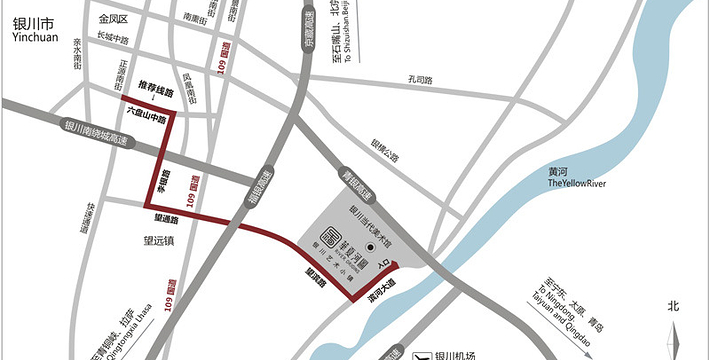 2.起点:银川南绕城-望远出口(望远互通立交桥)——景区:向正南方向出发,沿G109方向行驶向行驶2.3公里至望滨路交汇处,左转进入望滨路向东南行驶8.8公里至滨河大道交汇处,左转进入滨河大道向东北行驶2.8公里处,向北转入行驶2公里到达景区。