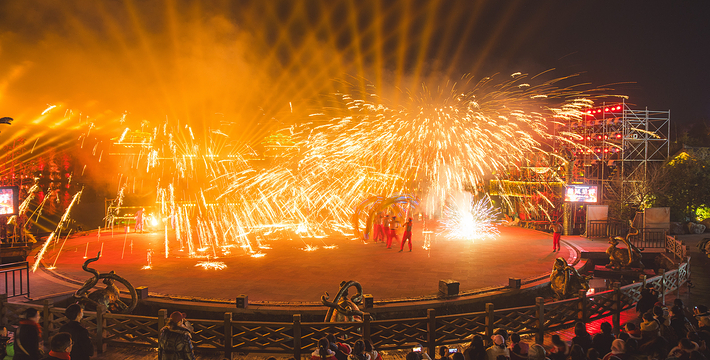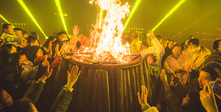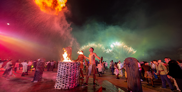 山镇中还有根据“ 太极生两仪,两仪生四象,四象生八卦”的概念规划的八座特色院落,乾天穹的天幕影院上演盘古开天辟地的神话故事,坤地谷以一场地宫漂流感受女娲补天的历险,还有离火殿中的水火大战,兑盐藏里惊艳飘逸的洒吉盐演出,无不充满玄妙乾坤。