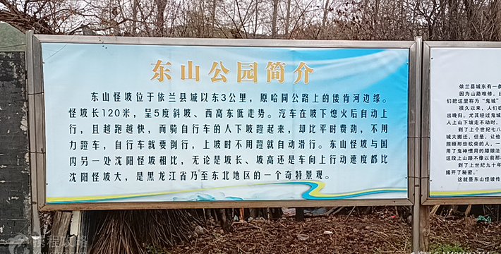依兰怪坡位于县城东北3公里处。在怪坡上,汽车上坡不需加油即可自然向上行走,下坡却得加油。该怪坡山岭逶迤,林海苍茫,青山绿水,形情并茂。怪坡附近倭肯哈达洞穴。是新时器时期人类活动栖息的地方。到依兰观光的游客和路经依兰的过客,都不免被怪坡的奇景所吸引,亲自试试怪坡究竟有多怪。