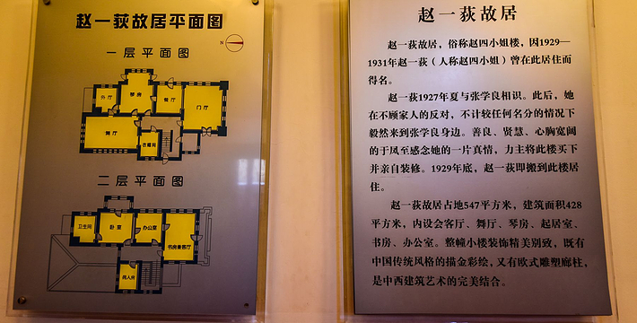 赵一荻故居,俗称“赵四小姐楼”,是全国重点文物保护单位张氏帅府博物馆的重要组成部分。1928年至1931年间,张学良将军和赵一荻女士在此居住,并生下了他们的爱子张闾琳。楼体赭石红,东方的框架结构,与人字梁结合构成大屋顶,木板封檐,西式仰瓦,形成典型的日本建筑风格,看上去好像一座独立的城堡。一楼设接待室、舞厅、餐厅等,二楼设会客厅、起居室、琴室、卧室、卫生间等。2001年11月底,正式向游人开放。整个小院清静幽雅,精巧别致。它由门厅、餐厅、琴房、舞厅、办公室、卧室和书房兼会客厅等十余个房间组成。经过精心维修和多方考证,复原陈列后的赵一荻故居再现了赵四小姐与张学良将军当年共同生活的真实场景,向人们讲述着他们传奇的爱情故事。