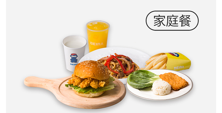 黑椒牛肉意大利面,橙味果汁,热牛奶,鸡排饭,汉堡,白薯条。