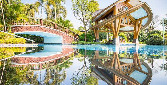 英德宝墩湖湖山温泉度假村,218栋以温泉为主题的新东南亚建筑风格别墅群,环千亩原生湖而立,如同冬日里被温暖泉眼吸引而来的鱼群。温润泉水倒影绵延山脉,如此奢侈的度假享受,他处难寻。 将这里纯天然的温泉引入到别墅当中,是旅游度假解乏的不二之选。