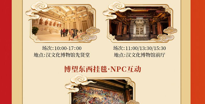 汉文化大会堂:在“汉文化博物馆”西侧的“汉乐府”。建成后以展示汉代歌舞和宴饮文化为主要*能。其中的“大飨宫”就是的大汉宫廷歌舞宴长乐盛会的主要场馆,试开园期间大飨宫只提供参观,让你身临其中,一眼千年。