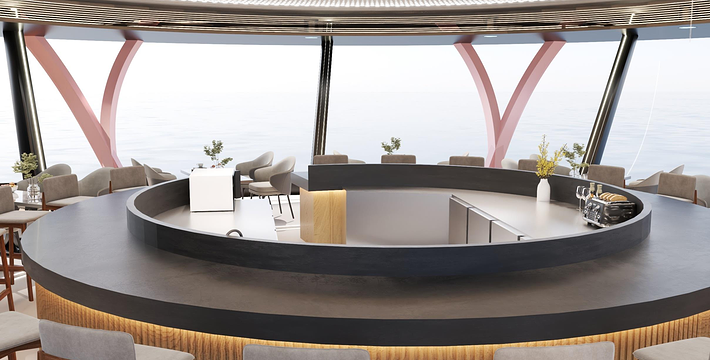 双层的客舱大厅内设有地毯、真皮沙发、大屏幕电视、餐台、舞台、吧台等设施,并设有豪华包房。顶层为露天游步甲板,可容纳全船游客在这里观海景,浴海风。这里是人们休闲、游览、娱乐、交友、商务活动及举办会议的理想场所。