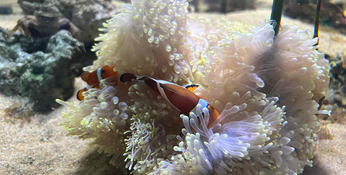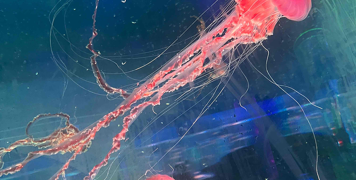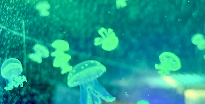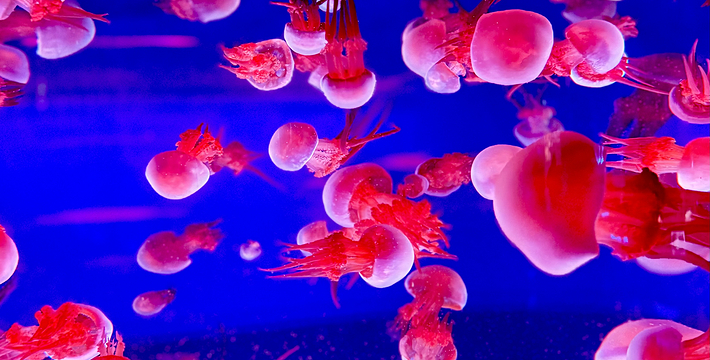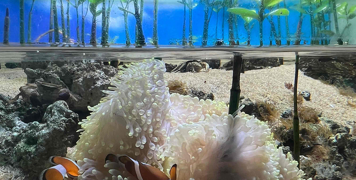 通过镜面折射出来的水母音乐厅,随着七彩光效不断变换,如梦如幻~ 站在水母玻璃缸前,让七彩光晕投射在脸上,分分钟出一张唯美大片!里面的珊瑚品种也非常多,羽毛香菇珊瑚、蘑菇葵花珊瑚......名字形象又生动。