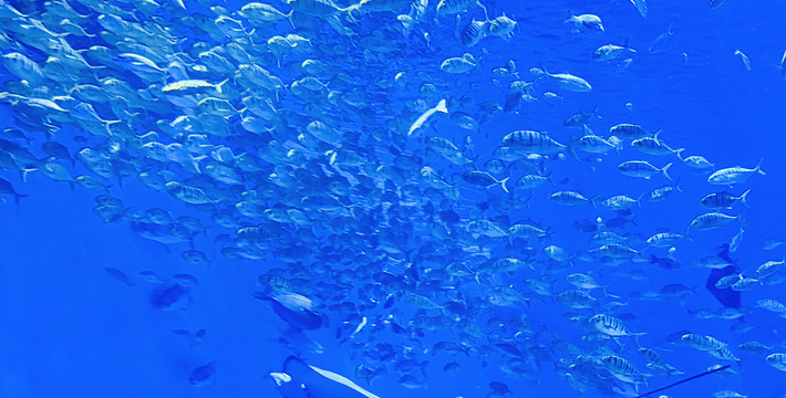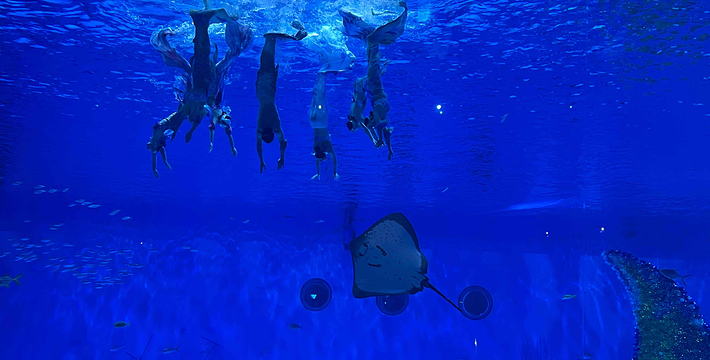 影片的名字叫《时空之海》,多重影幕秀将视觉冲击进一步升级,只见蓝鲸从头顶掠过,海浪将阳光卷成万千弥散的金箔。二十四米的球幕直径,画面清晰度是IMAX影片的4至6倍,44条声道的声音仿佛是流动的。兴奋与紧张交织,让你忘却周遭的一切。一步入画,大海的幽深壮美一览无遗。