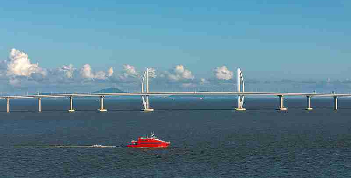 港珠澳大桥是一座连接香港、珠海和澳门的桥梁,非常壮观,港珠澳大桥是里程长、投资多、施工难度大的跨海桥梁项目。夜晚时分,桥上的灯光亮起后,夜景很迷人,就像一条发光的丝带飘在海面上。