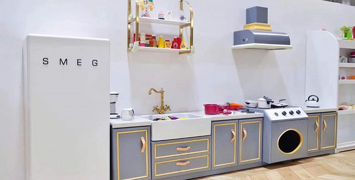 二.餐饮区:色调以白色为主,明亮温馨,马卡龙色系的椅子橱柜等细节则尽显梦幻童趣