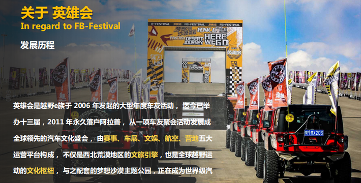 英雄会是越野E族于2006年发起的大型年度车友活动,迄今已举办十三届,2011年永远落户阿拉善,从一项车友聚会活动发展成全球领先的汽车文化盛会,由赛事、车展、文娱、航空、营地五大运营平台构成,不仅是西北荒漠地区的文化引擎,也是全球越野运动的文化枢纽。