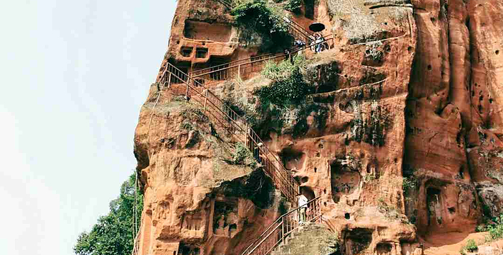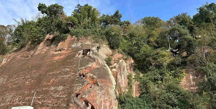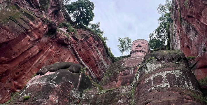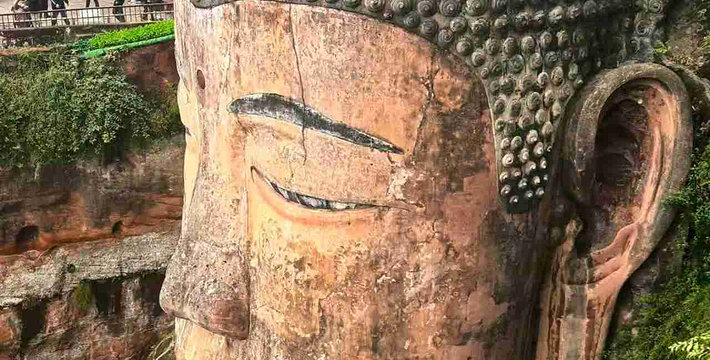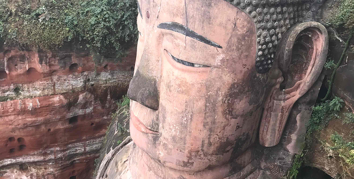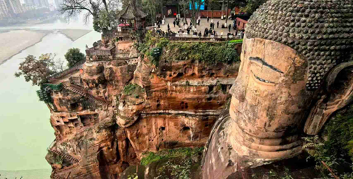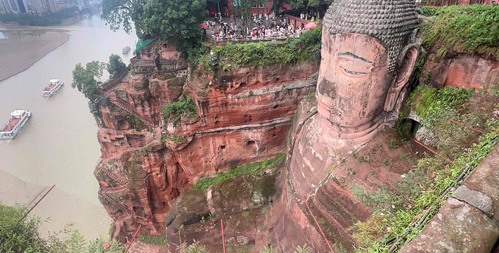 大佛左侧,沿“洞天”下去就是近代开凿的凌云栈道的始端,全长近500米。右侧是唐代开凿大佛时留下的施工和礼佛通道——九曲栈道。爬上栈道,能从不同高度瞻仰大佛威仪。