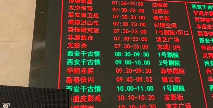 沉浸式裸眼3D“幻境空间”,坐上虚拟过山车穿越丛林,驾驶飞船穿行宇宙空间,跟随小海龟海洋冒险……八种穿越奇遇,飞一般的探险旅程,带你上天下海入地。行浸式网红打卡点“光影秀”,一个七彩斑斓的梦幻世界。遨游无边宇宙、仰望璀璨星空、穿梭奇幻丛林……情侣闺蜜、亲子遛娃、全家出游皆可打卡,好玩又出片。大型互动体验项目《延安保卫战》,一场气壮山河的鏖战,一次涤荡心灵之旅,一起进入“战场”,铭记历史,珍惜和平!景区内《旋鼓舞》《花间舞》《国风快闪秀》《簪花仕女图》等数十台演艺秀,总有一款适合你。