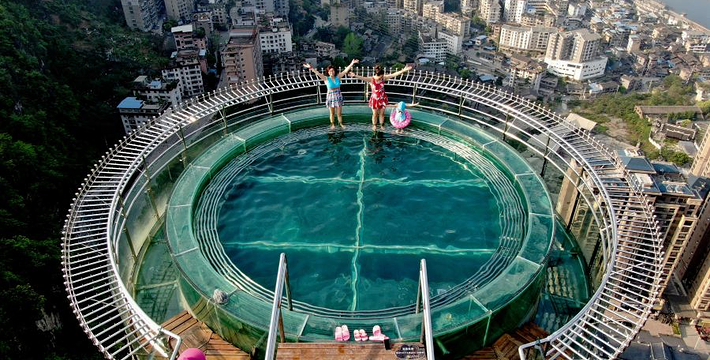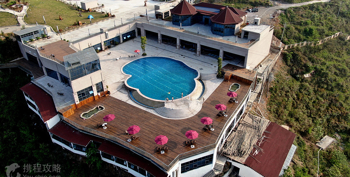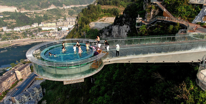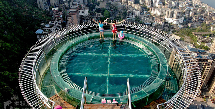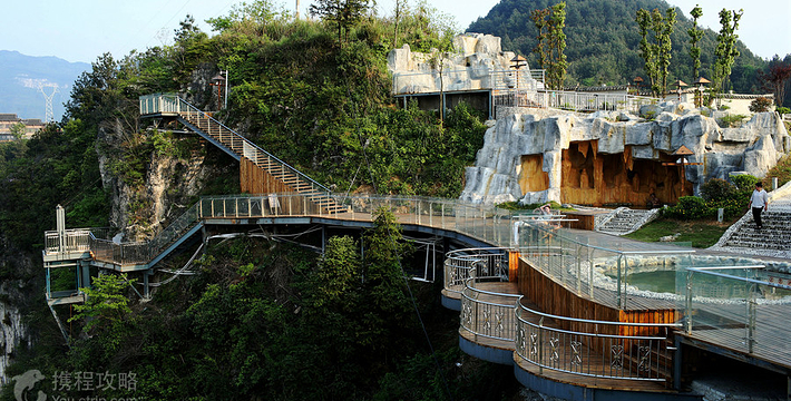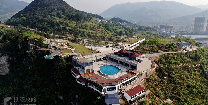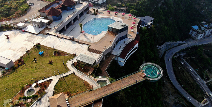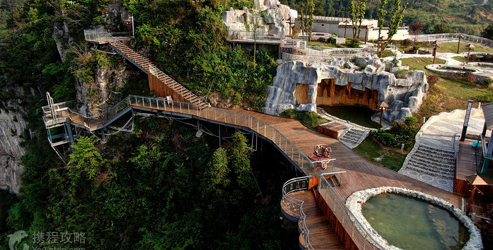 悬崖温泉建在乌江崖岸并紧临古城“城际线”的兽王山顶,距离奔腾乌江大约200米,比城市“中间线”高出180余米。