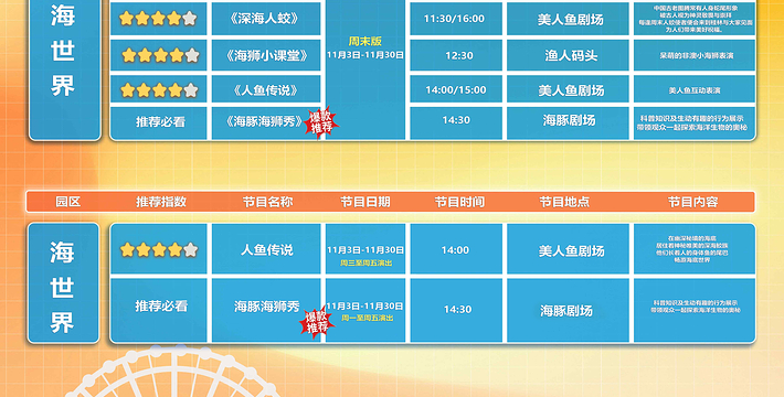 11月1日-11月14日,欢乐部落、海世界10:00-18:00,17:00停止取票入园,11月15日-11月30日,欢乐部落、海世界10:00-17:00,16:00停止取票入园。