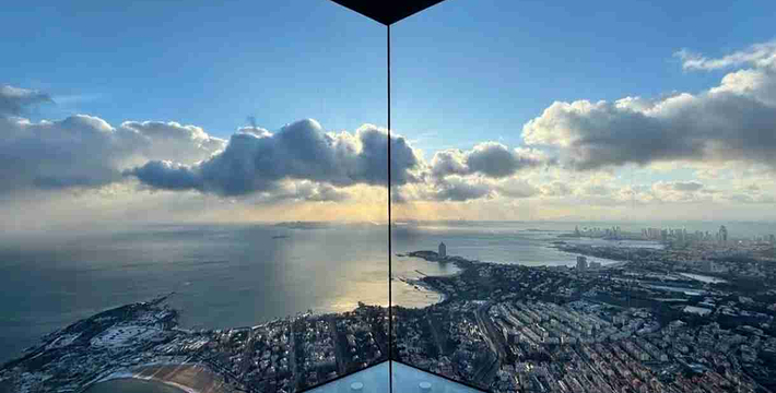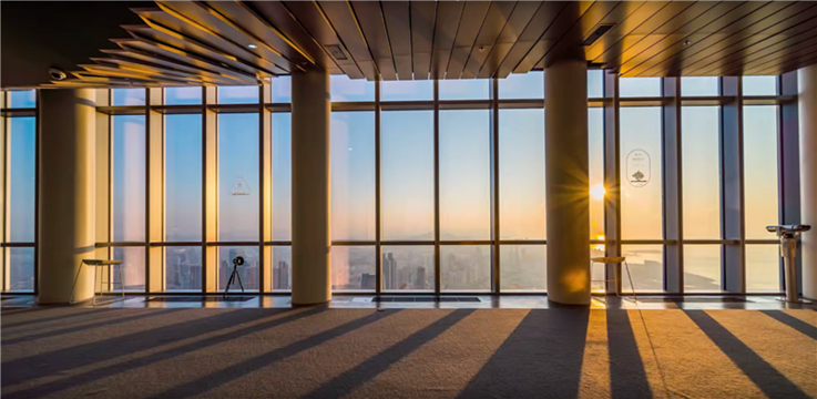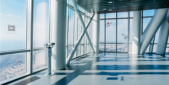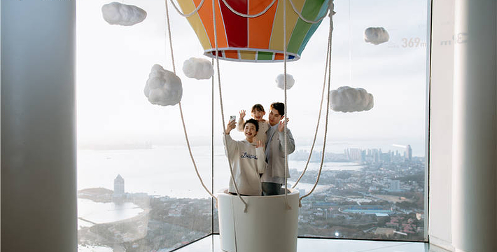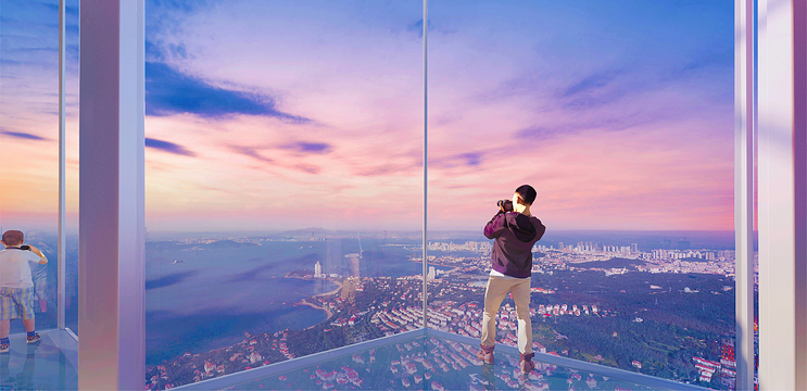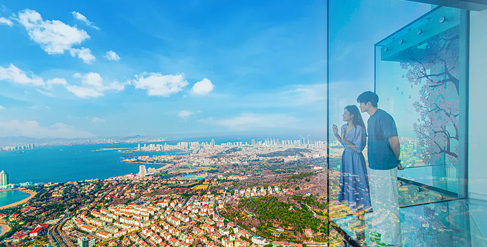 海天中心城市观光厅是山东省超高层垂直建筑之上的高空观光平台。在这里,向西可揽胜八大关老城区红瓦绿树,向东承接新城区璀璨繁华,360°俯瞰壮美海景、山景、城景,全方位感受身处"天空之城"的独特体验。其内部设置的透明观景区、沉浸式体验区、多媒体展示区与空中水吧等多个*能空间,将内部游览体验与外部自然景观融为一体。站在369米之上的城市观光厅,可以看尽因海而生、向海而兴的魅力青岛在时间长河中的风貌变迁与发展动线。随着观光者的漫步,不同姿态的青岛都将尽收眼底。