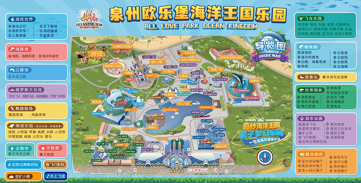 泉州欧乐堡海洋王国乐园以海洋文化为主题,分为鲸鱼湾、企鹅馆、热带雨林、海底世界、江豚馆、海豚馆、天鹅堡、童话世界八大分馆;乐园拥有阵容宏大的七大明星表演--白鲸之恋、海豚奇缘、海狮学院、海象尬舞、人鱼传说、水中芭蕾以及由中外演员精彩奉上国际级马戏盛宴--欧乐堡大马戏,带来空中飞人、皇家马队、极限魔轮、环球飞车等惊险绝伦的视听享受;引进了矿山过山车、大冲刺、天空飞翔、近战鲨鱼岛等20台套室外大型游乐设施,并打造了专属于儿童的室内乐园--童话世界;配套建设了以“大航海时代”为体验特色的郑和宝船酒店、“海洋科普”主题的研学酒店,以及以深海探秘为主题的郑和海洋酒店,一站式满足广大游客休闲度假、海洋科普、亲子游乐、研学旅行的出游需求,进一步丰富泉州城市群厦漳泉经济圈“亲子度假游”、“周末两日游”旅游产品的类型,助力泉州市乃至福建省文化和旅游产业的高质量发展。