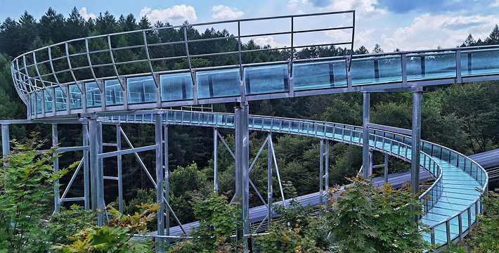 “一桥横跨两峰来,峡谷幽深费剪裁。天埑人工焉着力,云崖鬼斧也愁开。雾从脚底惊心过,声自空中巅步哀。鸟瞰红尘林树小,长虹飞落任君猜。”这首诗句把景区长约369米,高约150米,宽度3米的5D玻璃吊桥,长250米,宽0.8米玻璃滑道景色进行了真实的写照,走在高空的玻璃栈道看看脚下的近乎完美的原始的生态,在坐玻璃滑道自高而下,想想都刺激万分啊!爬山神器飞天魔毯带您轻松上山,转乘回程观光车结束愉快的玉龙溪之旅