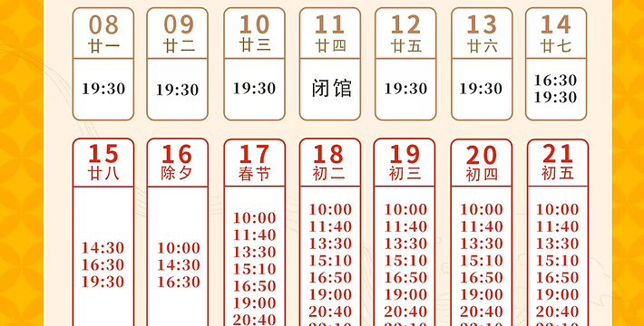 元旦,春节,清明节,劳动节,端午节,中秋节,国庆节;09:00-23:40开园;(22:20停止入园)