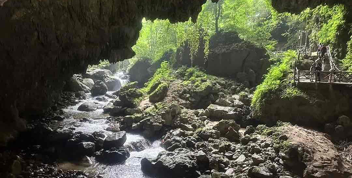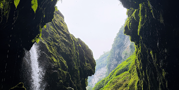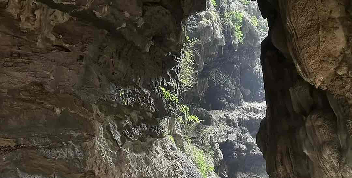 走进通灵大峡谷,巨型钟乳石高崖倒悬,古树老藤遮天蔽日,还有神秘莫测的洞穴和星罗棋布的深潭,可谓千奇百怪。通灵大峡谷由念八峡、铜灵霞、古劳峡、新灵峡、新桥峡组成,总长10多公里。念八河从古龙山脉缓蜒而下,依次穿越五个峡谷,流入湖润台地。每个峡谷内荟萃了举世罕见的特高瀑布群、洞中瀑布、地下暗河、峡谷溪流、洞穴奇观、古石垒、古悬葬、原始植被等自然景观与人文景观。通灵峡,1998年4月由靖西商会凌树明、黄丰正、覃海龙、曾德铨开发,位于大峡谷南端,是一个长方形全封闭式的峡谷,长约1000米宽200多米,深300米,犹如地球突然裂开一条缝,狭长而深邃。峡谷内密密匝匝的长满了原 始古树,四周刀削般的悬崖绝壁,也旁逸斜出的长满了婆娑多姿的树木。