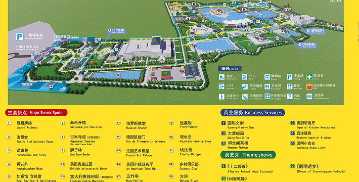 《梦幻圆明》大型多媒体激光水秀《梦幻圆明》。LED影像、电脑探照灯群、激光阵、烟花、火墙、火炮、山体灯群多种高科技手段,讲述了圆明园从被毁到重生的曲折历程,带给游客前所未有的视觉饕餮盛宴。长达40分钟的水秀表演带给现场万名观众,一轮又一轮的震撼。新长春园(夏苑)。它以北京圆明园盛时长春园为蓝本,按1:1比例建造。