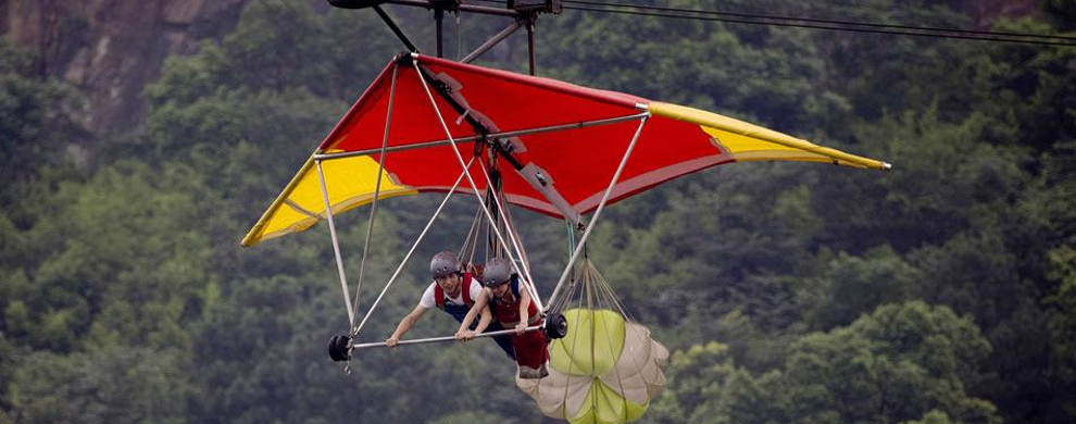 又称滑索飞渡,长480米,落差80米,每次可乘坐两人。乘坐该项目由狮子山顶起飞,降落在加勒比飓风湾的黑珍珠号海盗船上,在快速滑行中,俯瞰全园美景,让您心旷神怡。