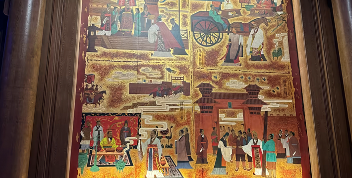 通过诸子百家廊,进入礼乐堂。这里规划为一个“礼乐”教室,也是一个特色剧场,可容纳八百多人。这里也是大型礼乐表演节目《金声玉振》的演出场地。