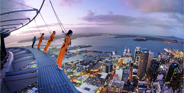 天空塔坐落在奥克兰的市中心,Hobson St. 和Victoria St.的街角。高328米,是奥克兰的标准性建筑。它与其他的建筑连成一体,组成巨大的天空城(Sky City),十个餐厅和酒吧,4星+宾馆,剧场以及许多独一无二的旅游冒险活动。它还有巨大的地下停车场和城际Bus总站。赌场是亚洲人经常光顾的地方,里面各种赌博应有尽有,还设有咖啡吧,经常有文艺表演助兴。每年春节还有中国文艺节目表演,例如舞狮。观看文艺表演是免费的,你进去后,可以不赌,只看表演。到赌场你必须衣冠整洁,否则不容许进场。对于大赌家,赌场专门设有贵宾室,有专人侍侯你进行豪赌。天空塔共有三部透明玻璃電梯,每15分鐘可乘載255人到達天空塔頂層186米处的主观景层和220。360度观赏奥克兰全景。 您也可以考驗自己的体力與毅力,挑战天空塔1,267阶的楼梯.由天空塔底层开始以時速四公里,需時29分钟爬上Sky Deck。据说,奧克蘭的天空塔曾經舉行爬樓梯競賽,競爭者中有人創下僅以5分17秒的時間爬上超過1000個階梯的驚人紀錄。上面还设有刺激惊险的Sky Jump,你从192米的天空塔往下跳,虽然有钢丝绳保险,但也需要极大的勇气。