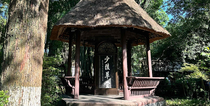 它是一座以茅草作顶的亭子,内树有一石碑,镌刻“少陵草堂”四个大字,笔力浑厚,笔姿秀润,是果亲王允礼所书。
